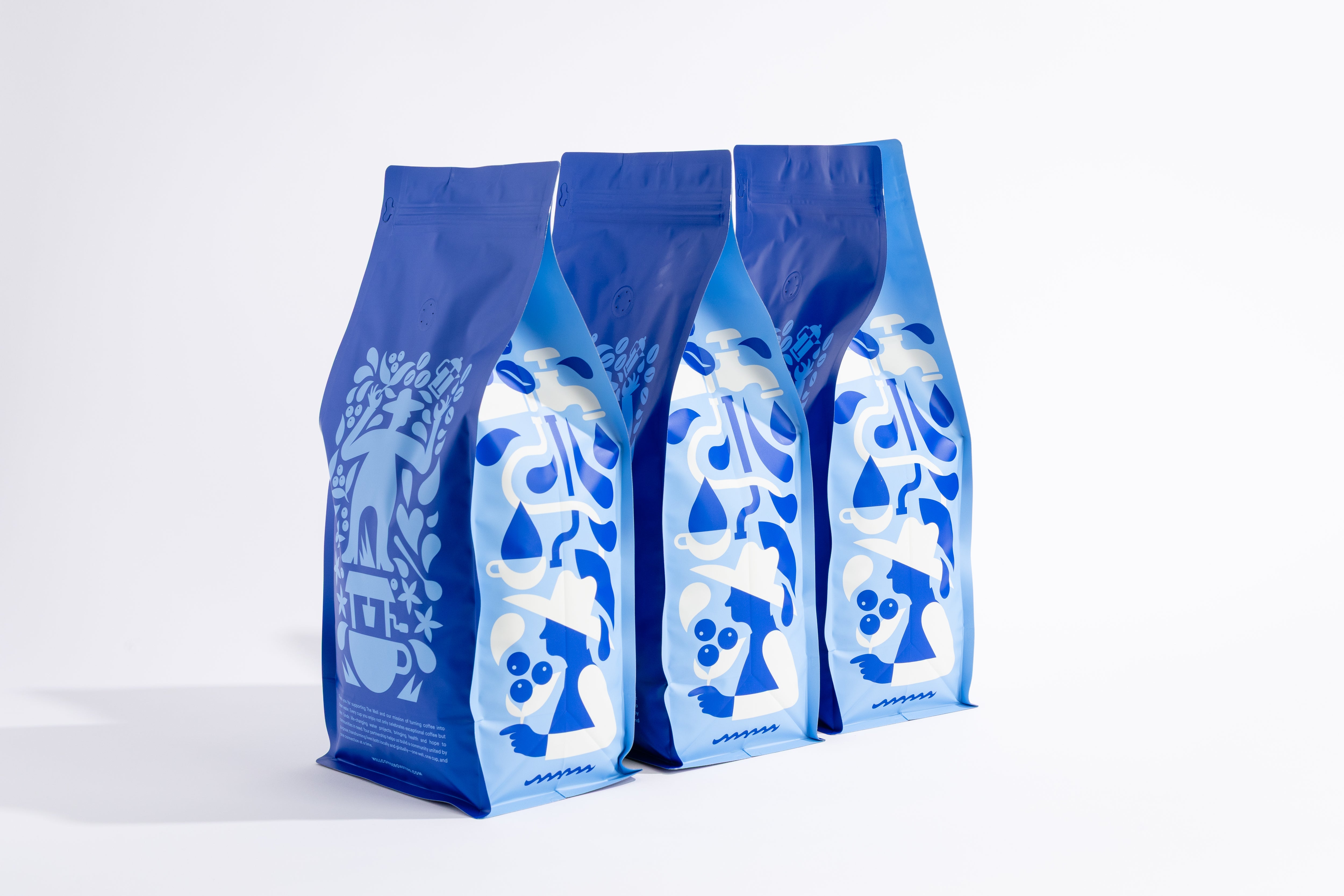 Each of our new bags, whether 12oz, 2lb, or 5lb, features colorful side gussets that illustrate the journey of Turning Coffee Into Water. These vibrant designs bring our mission to life, showing how every purchase flows from bean to clean water.